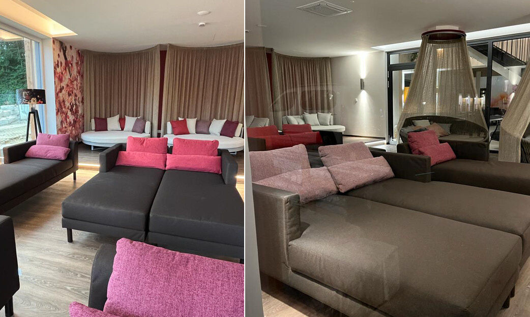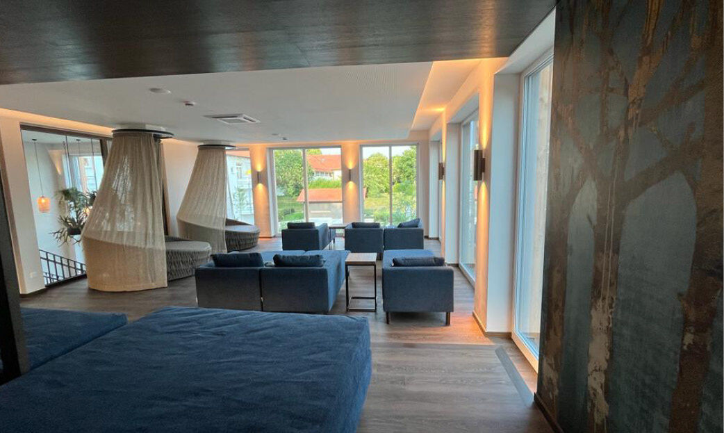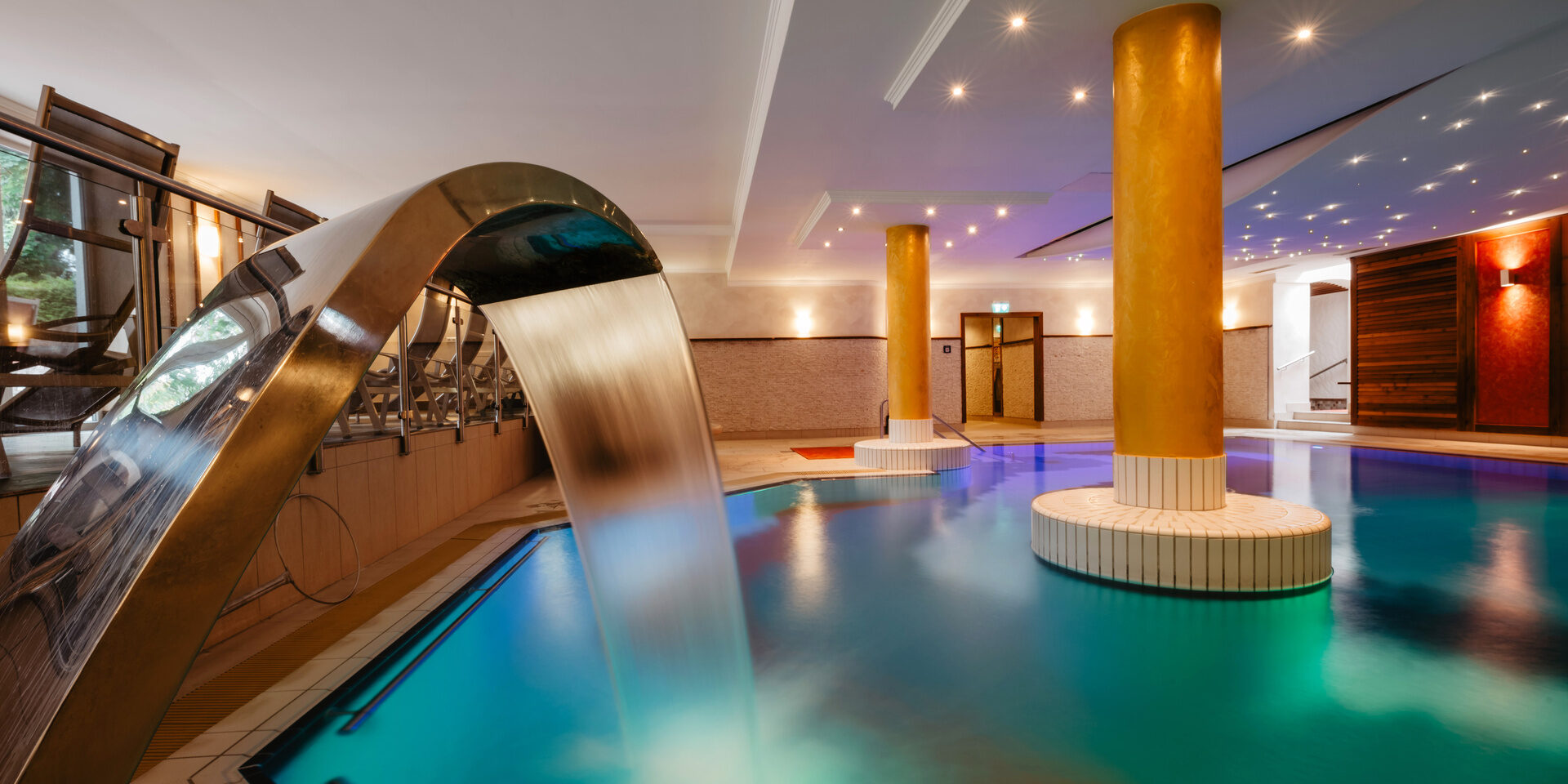 Sobald es draußen finster wird, tauchen spektakuläre Farbspiele den ganzen Thermalbadbereich in Ihre Lieblingsfarben. Sanftes Gold, brillante Meeresimpression in türkis, tiefes Dunkelblau oder sogar Schattierungen in Lila-Pink sind möglich.